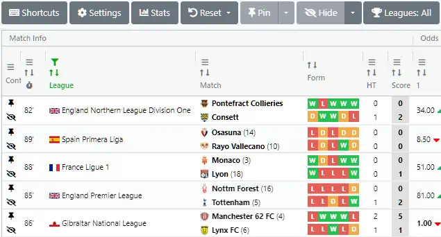 You can also click the arrows to sort how the games are displayed, either in ascending or descending order based on the column values. If the column features two team-specific values, the are summed together for the purpose of sorting (e.g. the goals of both teams are added together to sort by the total number of goals).